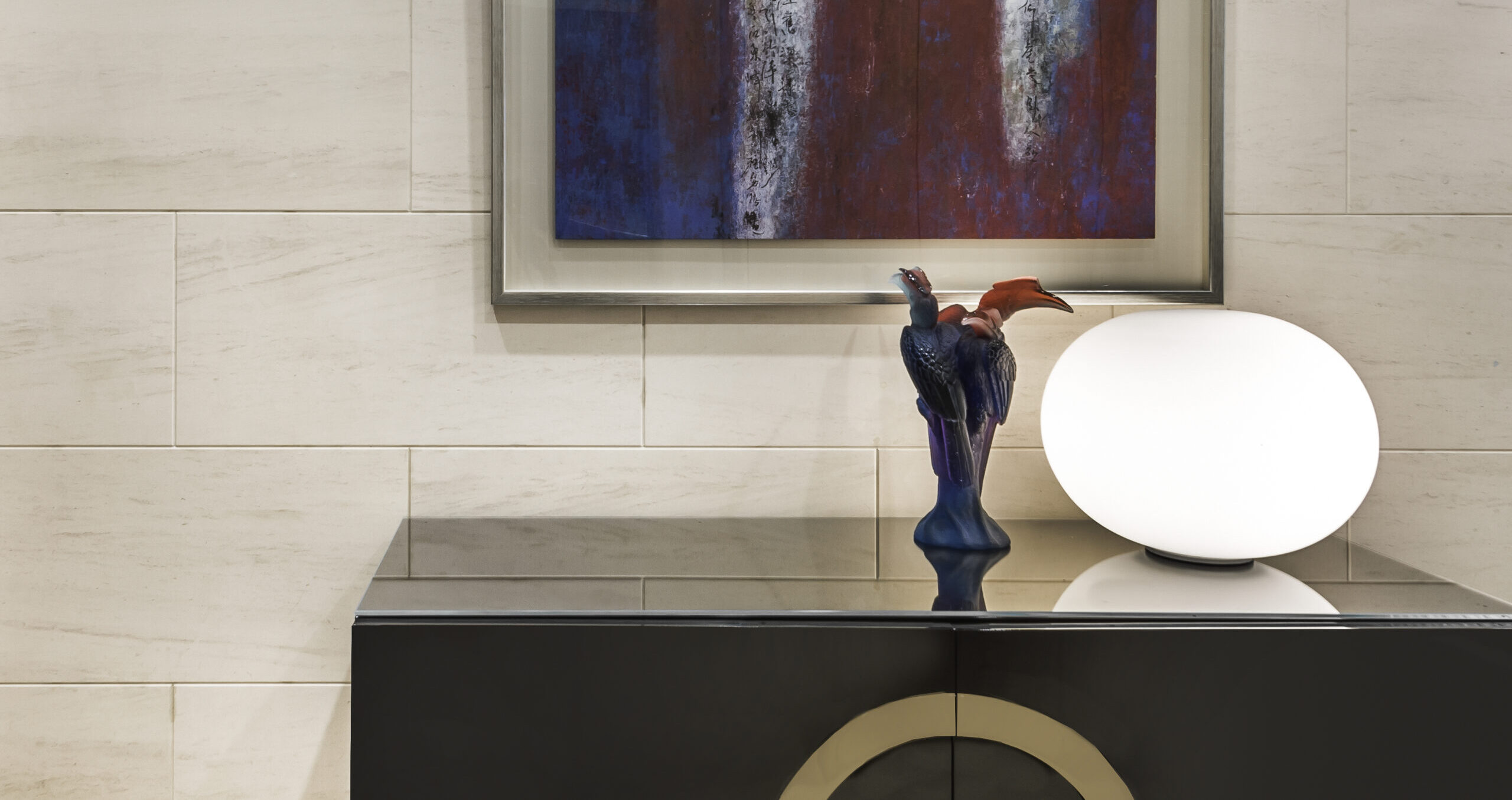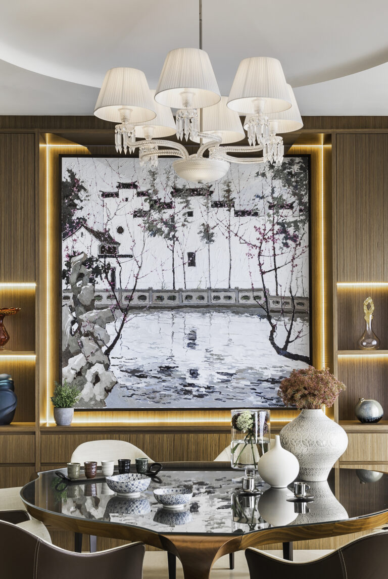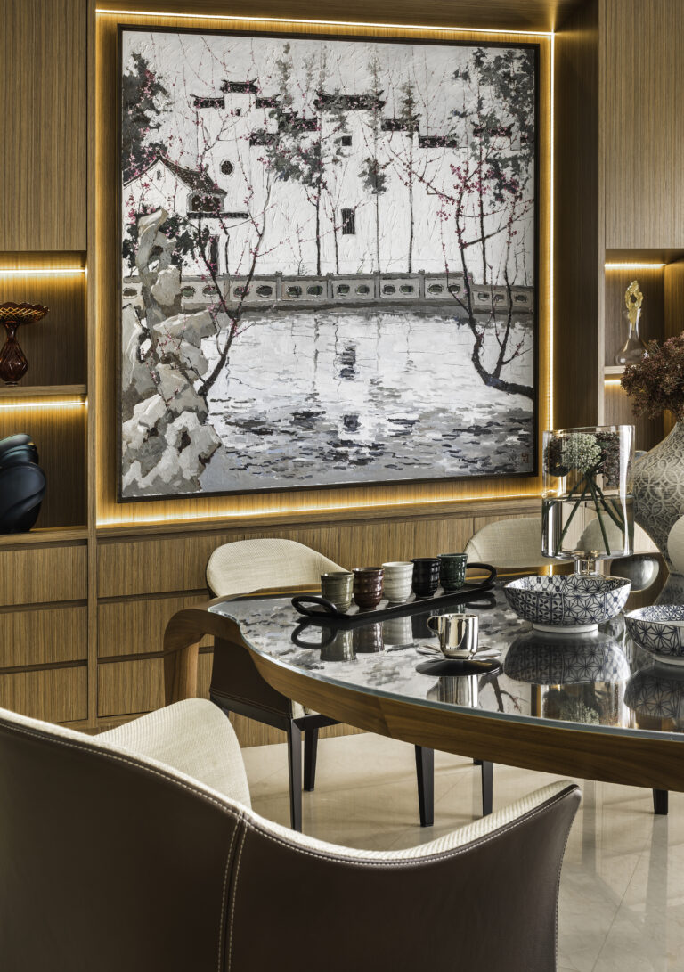 A Minotti sideboard artfully divides the dining area from the living space, and light beige curtains diffuse the natural light. An armchair harmonizes with a Minotti console and scented candles in a snug nook. The dining area, defined by a dome ceiling and another Baccarat chandelier, features a Giorgetti table and chairs alongside a bespoke wall showcasing a Chinese painting with graceful LED illumination.