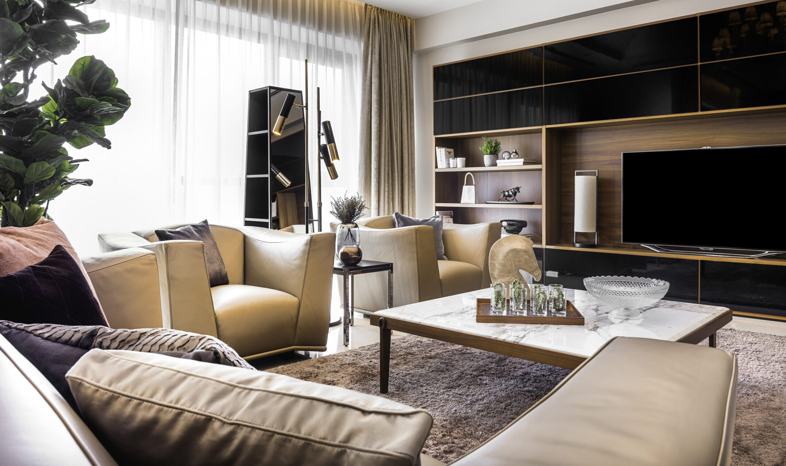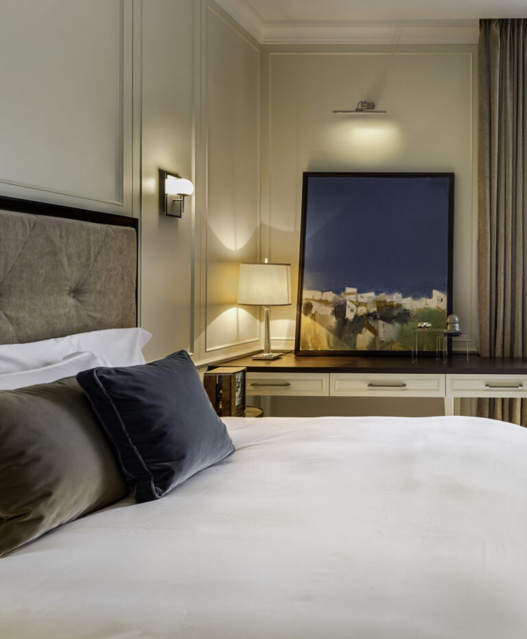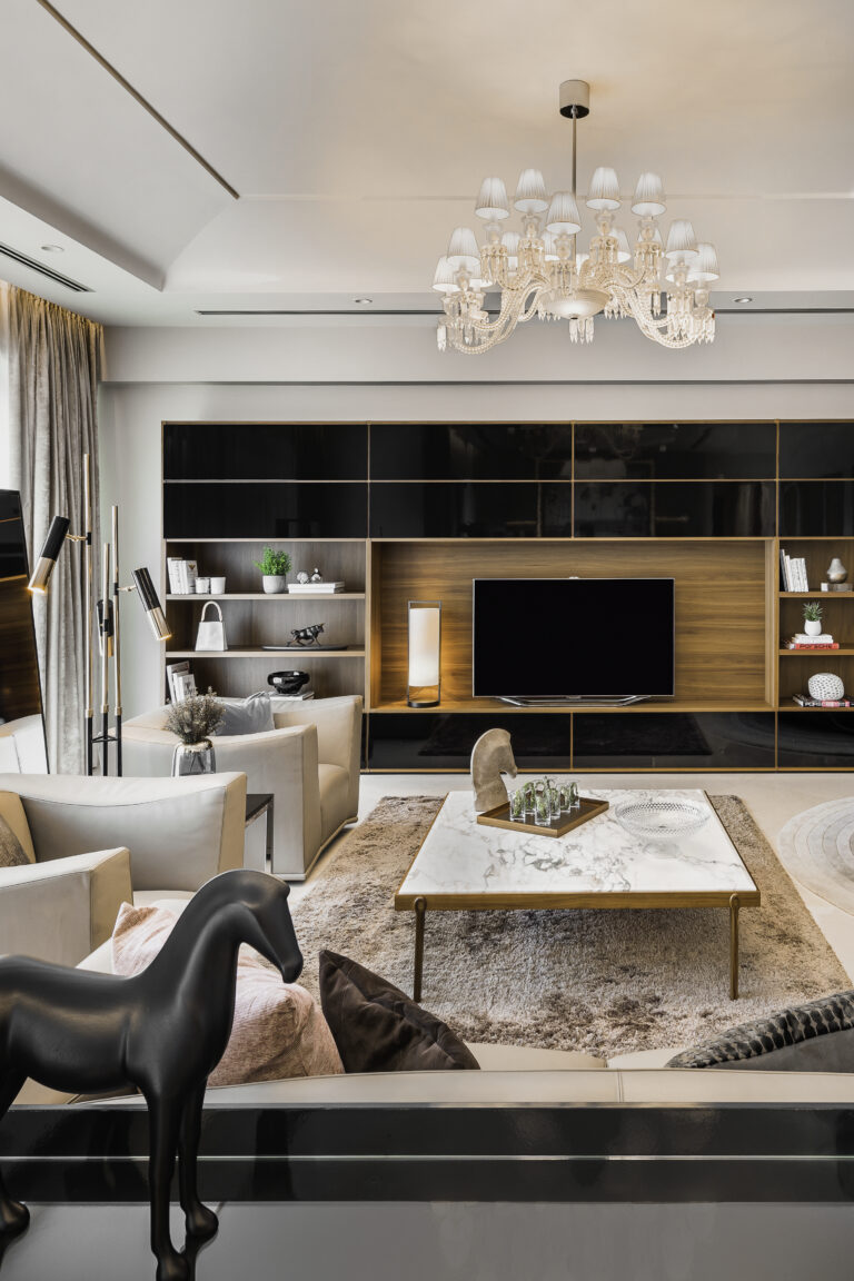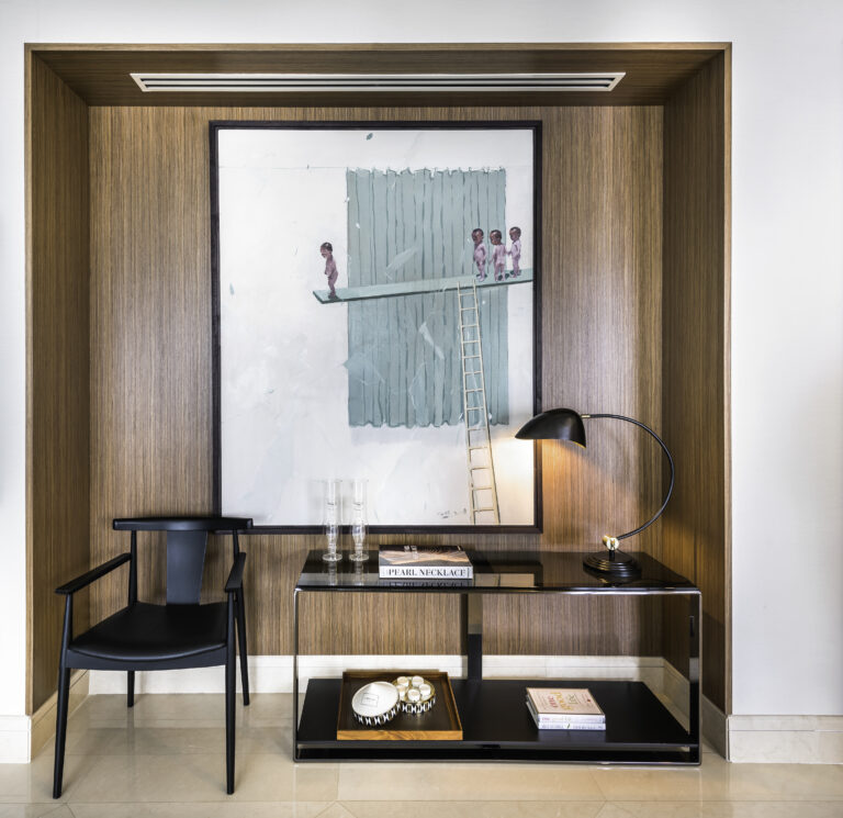 We envisioned a bright, airy space filled with ambient light accentuating the beauty of paintings and decorative accessories. The wood veneer wall panels invite art installations, perfectly accommodating the couple’s evolving collection. The living room radiates a calming, nature-inspired theme, where a crystal chandelier by Baccarat elevates the room’s height. Cosy leather seating and elegant marble tables from Giorgetti create warmth, while Hermès accessories add captivating visual interest.